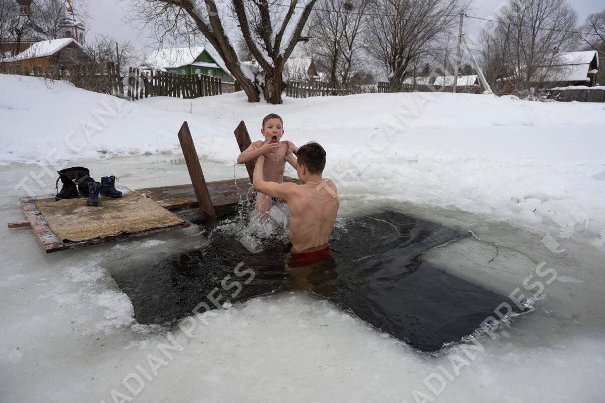 A man and his child bathe in the icy water of Veksa river on Epiphany in Kupanskoye village, Yaroslavl region, 150 km (94 miles) north of Moscow, Russia, Wednesday, Jan. 19, 2022. Across Russia, the devout and the daring are observing the Orthodox Christian feast day of Epiphany by immersing themselves in frigid water through holes cut through the ice of lakes and rivers. Epiphany celebrates the revelation of Jesus Christ as the incarnation of God through his baptism in the River Jordan. (AP Photo/Maxim Marmur)