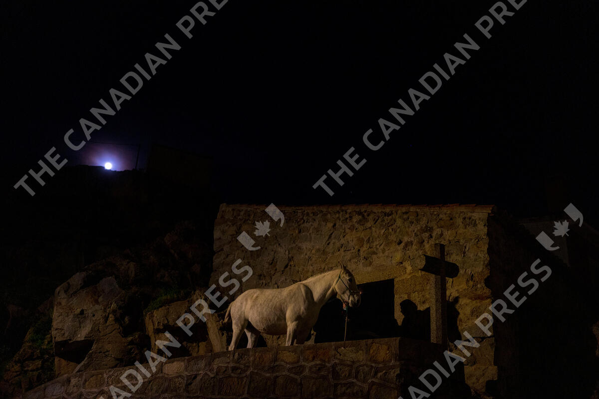 A horse stands next to a cross before ritual in honor of Saint Anthony the Abbot, the patron saint of domestic animals, in San Bartolome de Pinares, Spain, Sunday, Jan. 16, 2022. On the eve of Saint Anthony's Day, dozens ride their horses through the narrow cobblestone streets of the small village of San Bartolome during the "Luminarias," a tradition that dates back 500 years and is meant to purify the animals with the smoke of the bonfires and protect them for the year to come. (AP Photo/Manu Fernandez)