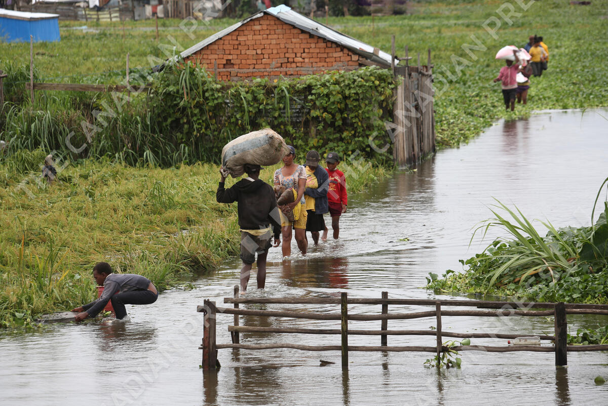 Residents wade through flood water around their homes after heavy rain in Antananarivo, Wednesday, Jan. 19, 2022. Officials in Madagascar say that heavy rains have flooded parts of the capital city, Antananarivo, killing 10 people and making more than 12,000 homeless. With the rains continuing and a possible cyclone approaching the Indian Ocean island, officials warned of possible landslides in the capital city, which is built on steep hills. (AP Photo/Alexander Joe)