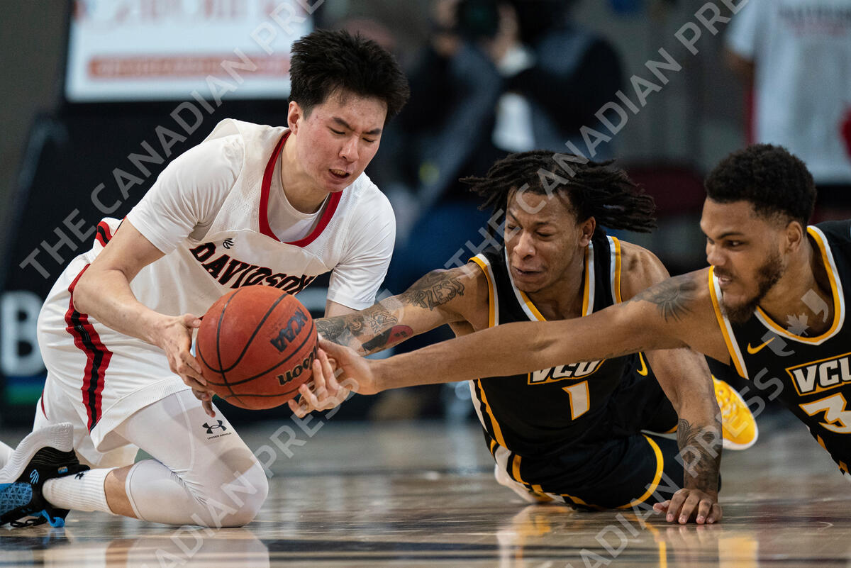 Davidson guard Hyunjung Lee (1) fights for the ball with Virginia Commonwealth guard Adrian Baldwin Jr. (1) and forward Levi Stockard III (34) during the second half of an NCAA college basketball game in Davidson, N.C., Wednesday, Jan. 26, 2022. (AP Photo/Jacob Kupferman)