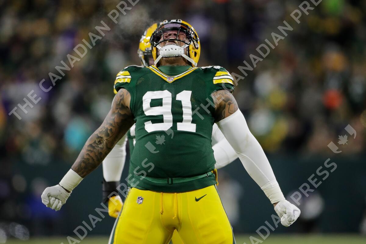THIS CORRECTS THE IDENTIFICATION OF THE MINNESOTA VIKINGS PLAYER TO SEAN MANNION AND NOT NATE STANLEY AS ORIGINALLY SENT - Green Bay Packers' Preston Smith reacts after sacking Minnesota Vikings' Sean Mannion during the first half of an NFL football game Sunday, Jan. 2, 2022, in Green Bay, Wis. (AP Photo/Aaron Gash)