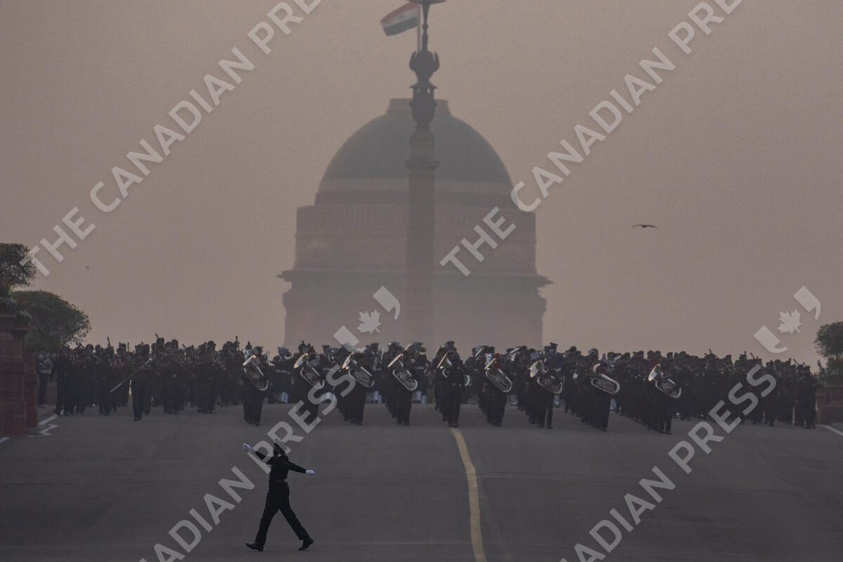 An Indian army conductor leads a military band during rehearsals for the upcoming Beating Retreat ceremony at Raisina hill which houses India's most important ministries and the presidential palace in New Delhi, India, Wednesday, Jan. 19, 2022. The ceremony held annually on Jan. 29 marks the end of Republic Day festivities. (AP Photo/Altaf Qadri)