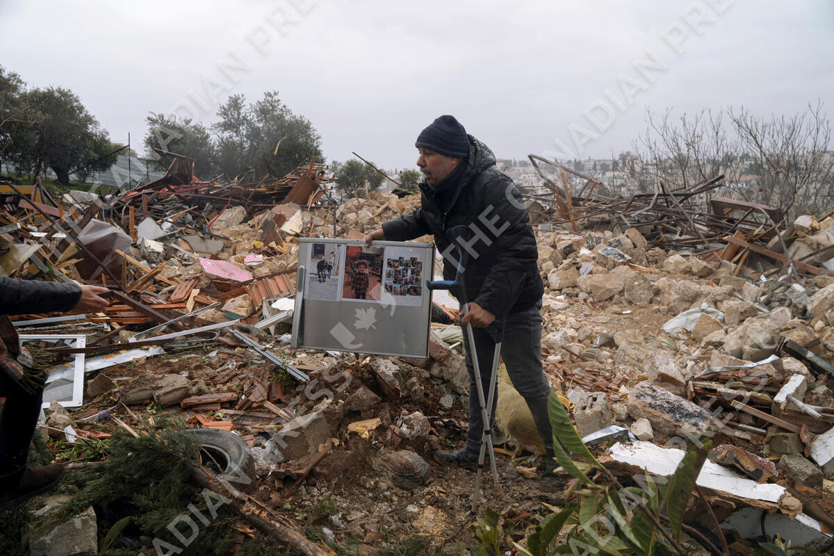 A Palestinian man carries family photos at the ruins of a house demolished by the Jerusalem municipality, in the flashpoint east Jerusalem neighborhood of Sheikh Jarrah, Wednesday, Jan. 19, 2022. Israeli police on Wednesday evicted Palestinian residents from the disputed property and demolished the building, days after a tense standoff. (AP Photo/Mahmoud Illean)