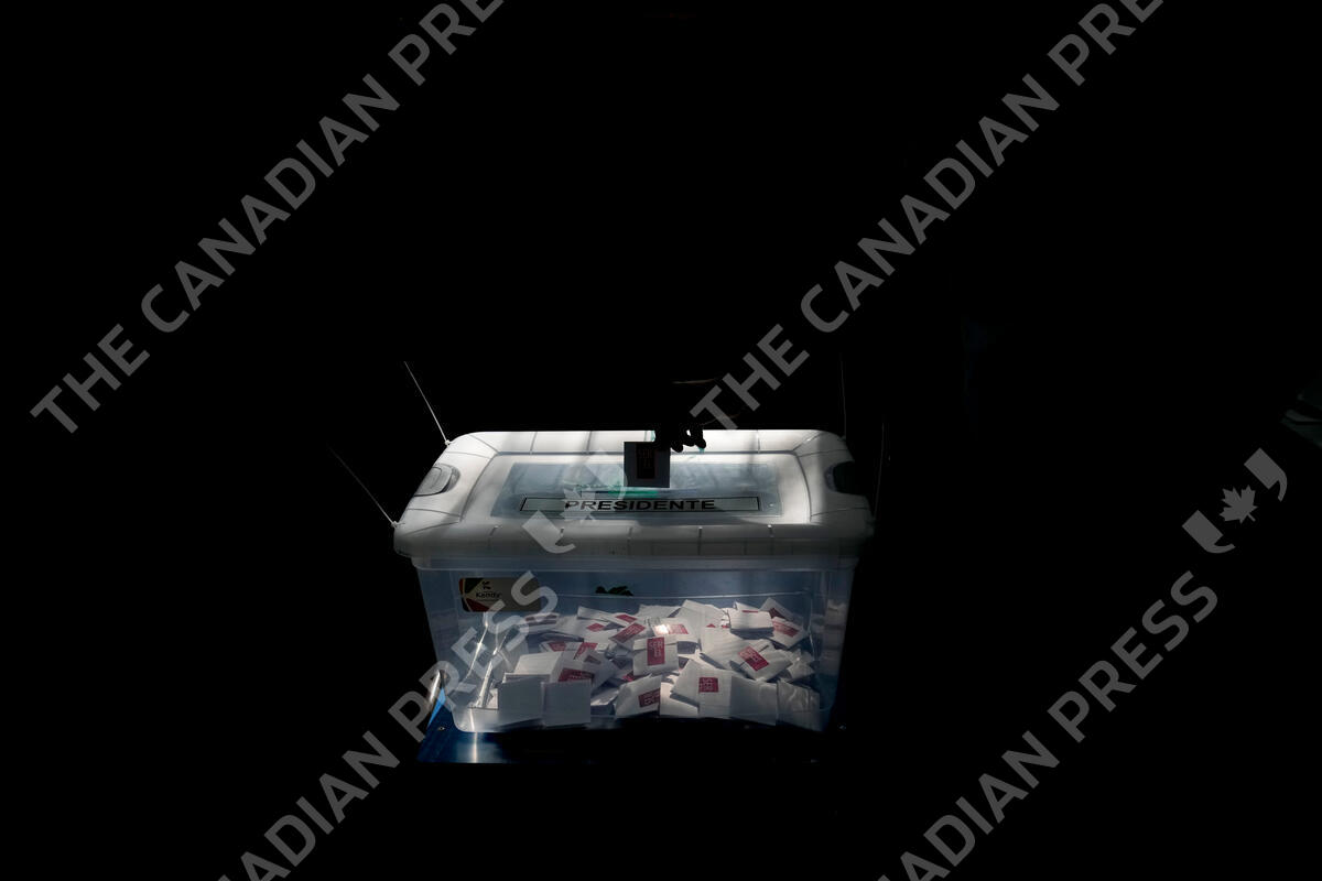A box holds marked ballots as a man drops his ballot into it at a polling station during the presidential runoff election in Santiago, Chile, Sunday, Dec. 19, 2021. (AP Photo/Esteban Felix)