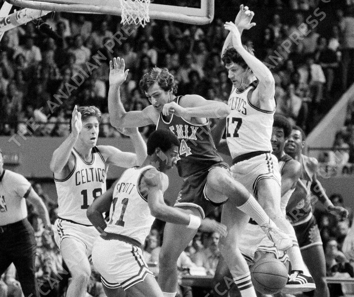 FILE - Boston's Dave Cowens, left, Charlie Scott (11) and John Havlicek team up on Paul Westphal, of the Phoenix Suns, as they try to go for a rebound during the first period of an NBA championship game at the Boston Garden, June 4, 1976. The longest game yet at the NBA Finals happened between the Boston Celtics and Phoenix Suns with the series tied at 2 apiece. (AP Photo/Peter Southwick, File)