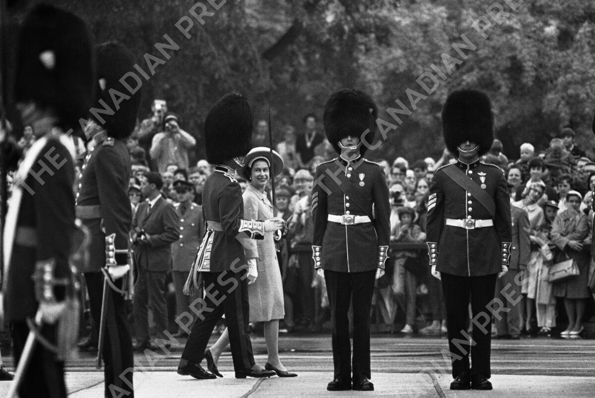 Queen Elizabeth II smiles up at sword-carrying captain of the guards at Canada?s National War Memorial in Ottawa on June 30, 1967 as she inspects the troops after placing a wreath at the memorial. The Queen and Prince Philip swung into a full day of activities in their six-day tour of Canada. (AP Photo)