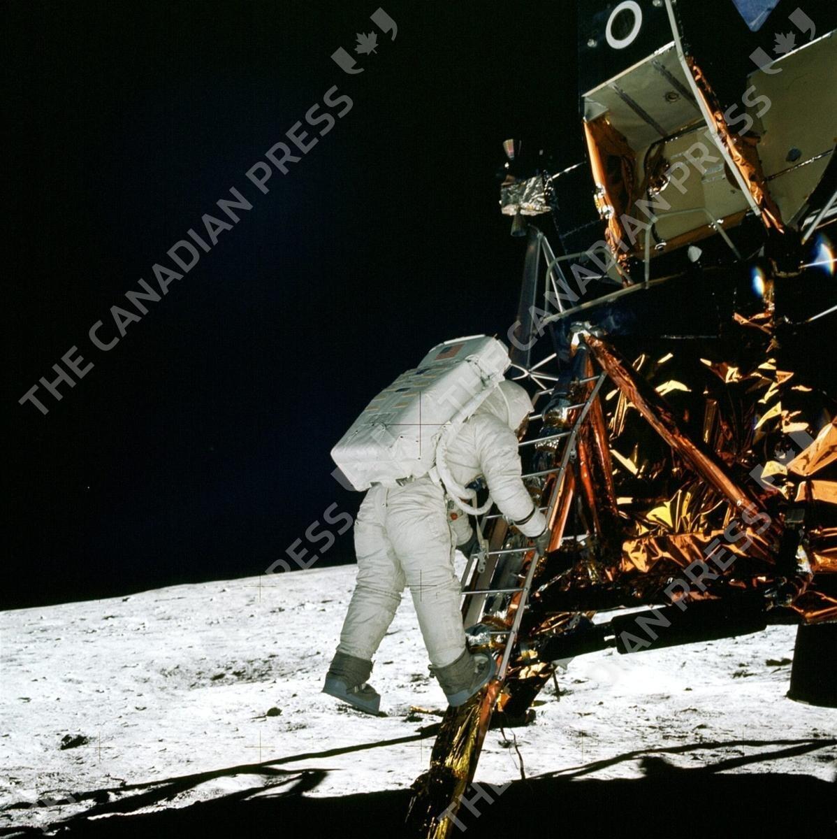 The Moon - (FILE) -- Apollo 11 Lunar Module pilot Edwin Aldrin climbs down the ladder to the Moon's surface as Commander Neil Armstrong photographs his descent. Aldrin stepped onto the surface on Sunday, July 20, 1969, 11:15 EDT and became the second person to walk on the Moon. Photo by CNP/ABACAPRESS.COM