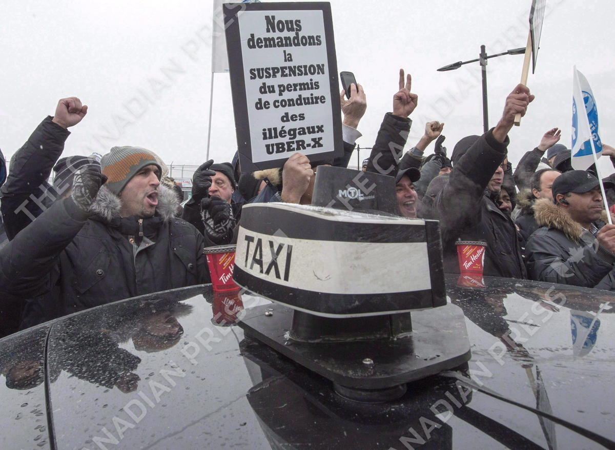 Taxi drivers take part in an anti-Uber protest at Trudeau Airport Wednesday, February 10, 2016 in Montreal. Time is running out for the Quebec government and ride-hailing service Uber to agree to a pilot project in the province. THE CANADIAN PRESS/Ryan Remiorz