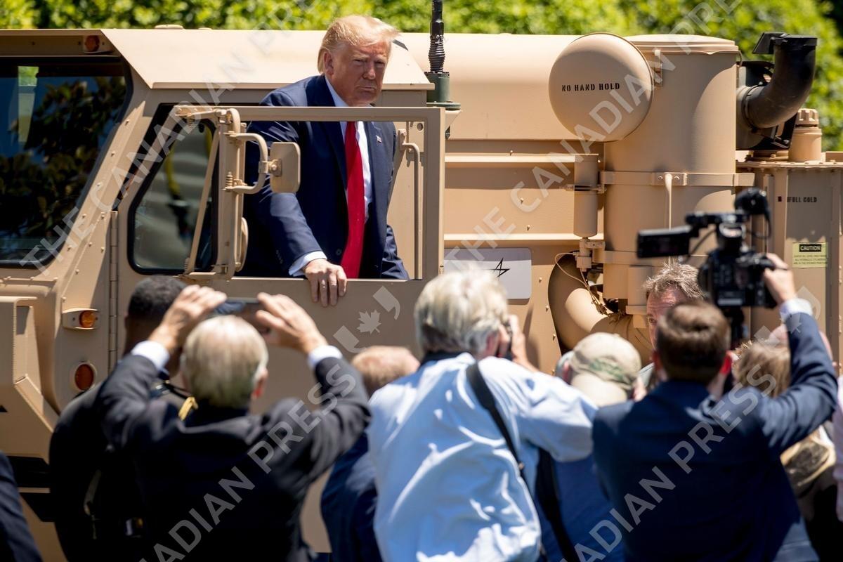 President Donald Trump gets out of the driver's seat of Lockeed Martin's Terminal High Altitude Area Defense (THAAD) anti-ballistic missile defense system during a Made in America showcase on the South Lawn of the White House in Washington, Monday, July 15, 2019. (AP Photo/Andrew Harnik)