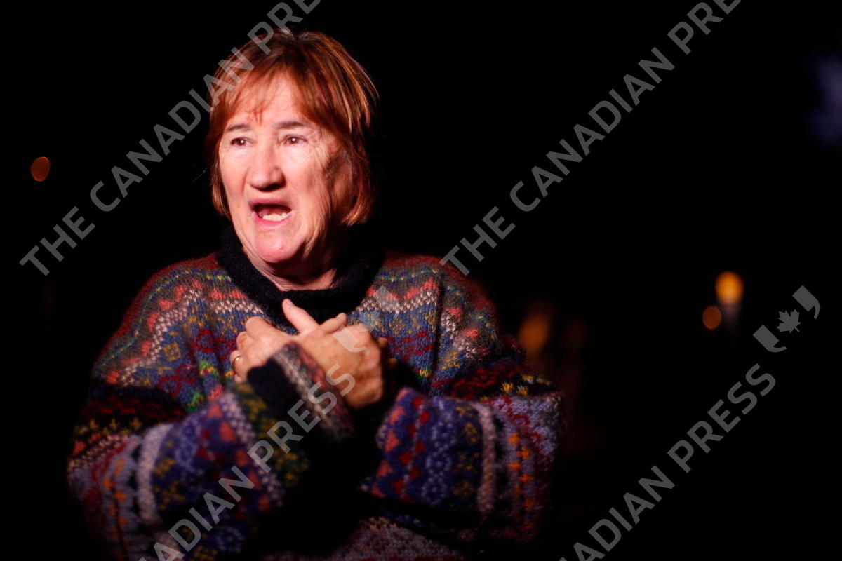 Local resident, Sheila Simpson, talks to reporters about how she helped out with rescued whale watching passengers as they were brought to the First St. dock after their tour boat capsized near Tofino, B.C., just after midnight, early Monday, October 26, 2015. THE CANADIAN PRESS/Chad Hipolito