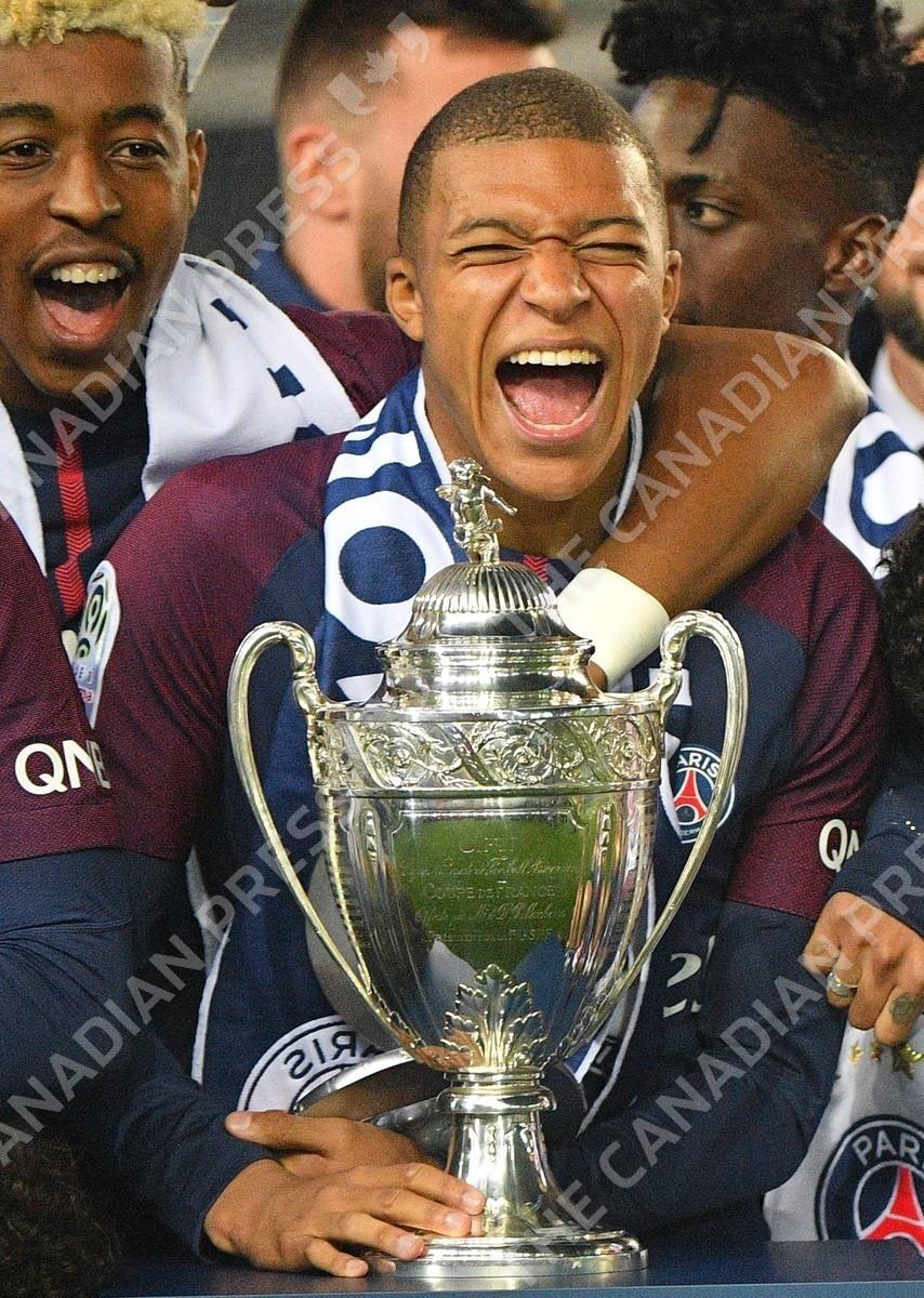 Paris Saint-Germain's Brazilian defender Thiago Silva, Paris Saint-Germain's French forward Kylian MBappe (L) and Paris Saint-Germain's Brazilian forward Neymar pose with a trophy after winning the French L1 title at the end of the French L1 football match Paris Saint-Germain (PSG) vs Rennes on May 12, 2018 at the Parc des Princes stadium in Paris. Photo by Christian Liewig/ABACAPRESS.COM