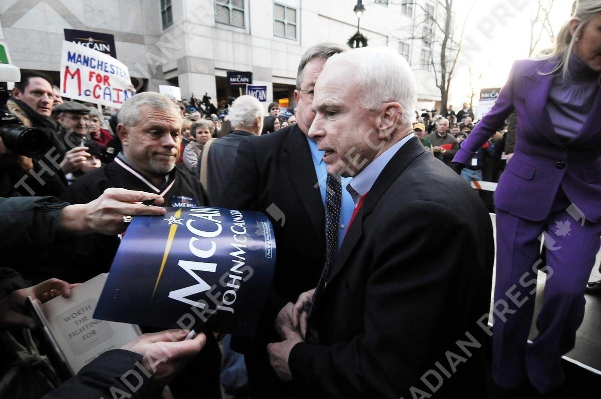 Republican presidential candidate and Arizona Senator John McCain arrives with wife Cindy at a 'The Mac is Back' rally outside the City Hall in Manchester, NH, USA on January 7, 2008. Candidates have converged on New Hampshire ahead of the January 8 state's primary.