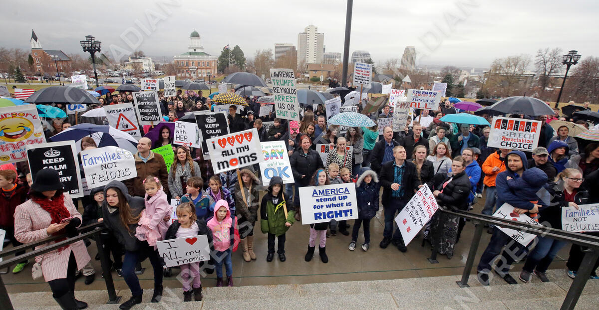 FILE - This Feb. 10, 2017, file photo, a group of pro-polygamy protesters rally at the state Capitol, in Salt Lake City. Utah decriminalized polygamy in 2020, reducing it from a third-degree felony, punishable by prison time, to an infraction on par with a speeding ticket. Advocates and residents of polygamous communities say the move has opened up previously closed societies and convinced more people to report abuse. (AP Photo/Rick Bowmer, File)