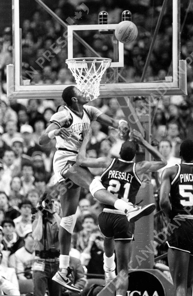 FILE - Georgetown's Patrick Ewing (33) blocks a shot by Villanova's Harold Pressley (21) during the NCAA men's college basketball tournament championship game in Lexington, Ky., April 1, 1985. After beating St. John's in the semis, Georgetown went up against another Big East rival, but fell short in its bid for a second straight title. (AP Photo/Bob Jordan, File)