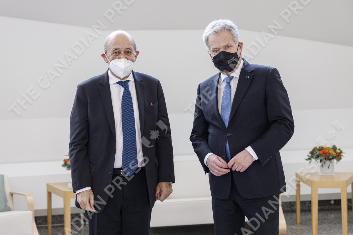 French Foreign Minister Jean-Yves Le Drian (left) and Finnish President Sauli Niinistö posing during their meeting at the official Presidential residence Mäntyniemi in Helsinki, Finland, on March 31, 2022. Minister Le Drian is in Helsinki on a one-day visit. LEHTIKUVA / SEPPO SAMULI - FINLAND OUT. NO THIRD PARTY SALES.