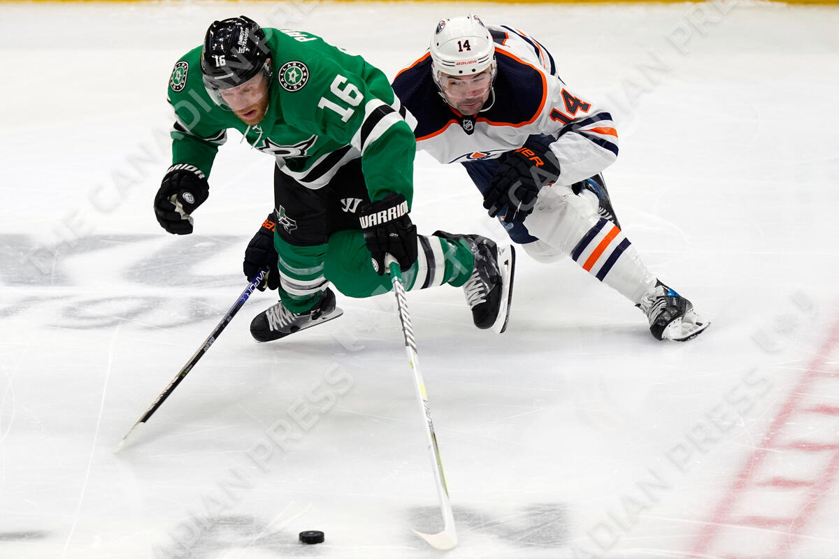 Dallas Stars center Joe Pavelski (16) and Edmonton Oilers center Devin Shore (14) chase the puck during the third period of an NHL hockey game in Dallas, Tuesday, March 22, 2022. (AP Photo/LM Otero)