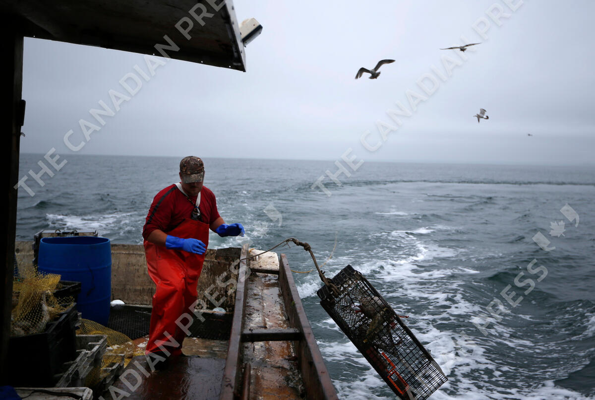 FILE - In this May 2, 2016, photo, Bobby Kent pushes a baited lobster pot into the waters of Long Island Sound off Groton, Conn. Only a handful of lobstermen still work the waters due to a dwindling lobster population. Federal funding has been approved to begin removing some of the hundreds of thousands of derelict lobster pots left behind on the floor of Long Island Sound, a "ghost fishery" that continues to trap and kill marine life to this day. (AP Photo/Robert F. Bukaty, File)