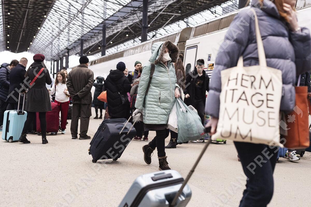 Passengers of the Allegro train from St. Petersburg, Russia, at the railway station in Helsinki, Finland, on March 27, 2022. Allegro train service between Helsinki and St. Petersburg will be temporarily discontinued on Monday, March 28, 2022. LEHTIKUVA / RONI REKOMAA - FINLAND OUT. NO THIRD PARTY SALES.