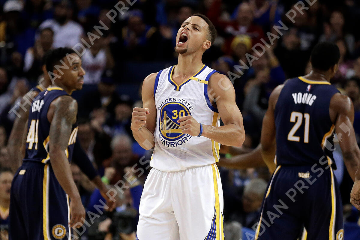 FILE - Golden State Warriors' Stephen Curry, center, celebrates a score against the Indiana Pacers during the first half of an NBA basketball game on Dec. 5, 2016, in Oakland, Calif. (AP Photo/Ben Margot, File)