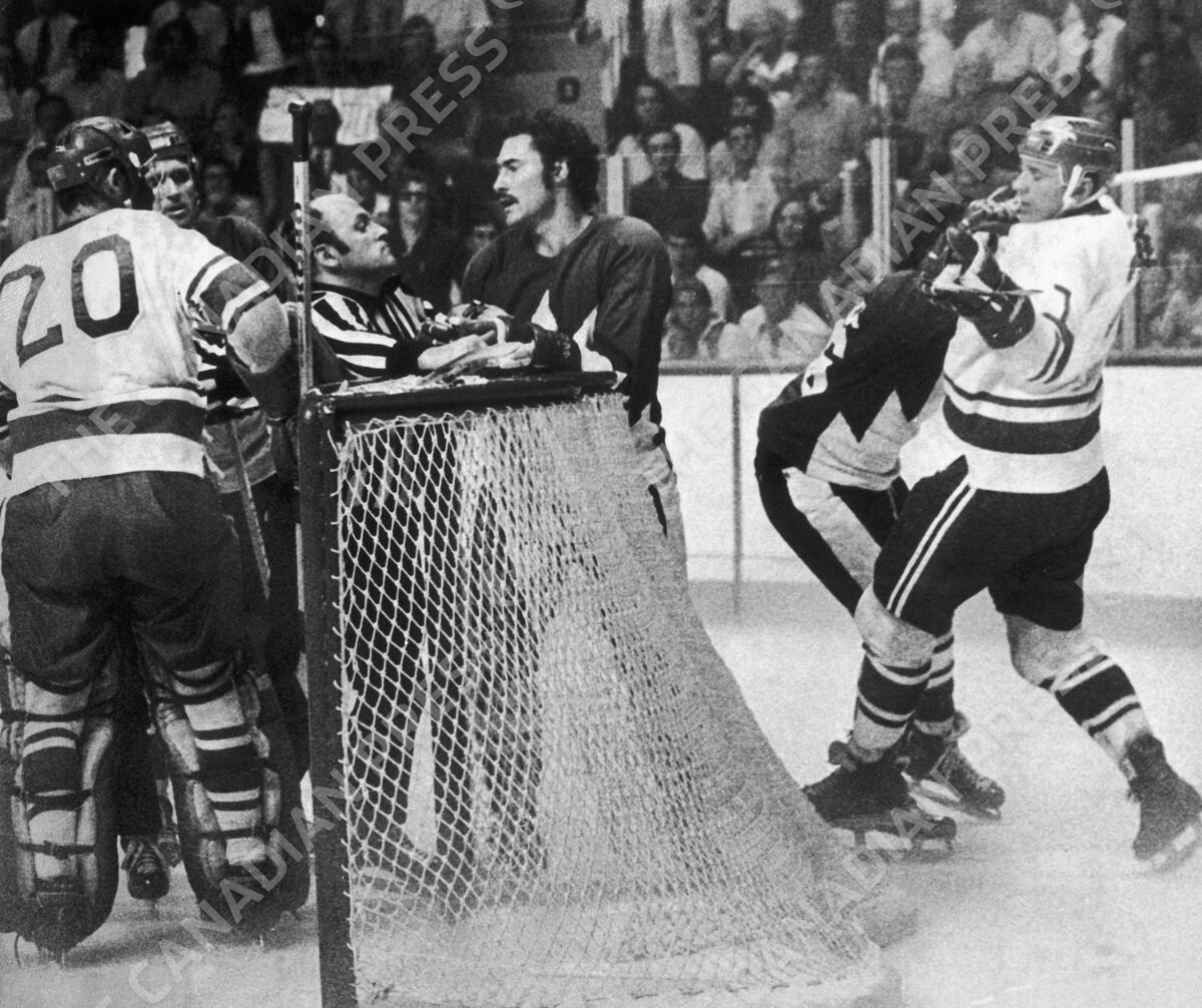 Mickey Redman, center, of Team Canada has a few words with the referee while another Team Canada player, second from right, has a shoving match with a Soviet player during the first Canada-Soviet hockey series in Montreal, Sept. 3, 1972. (AP Photo/CP/DMB)