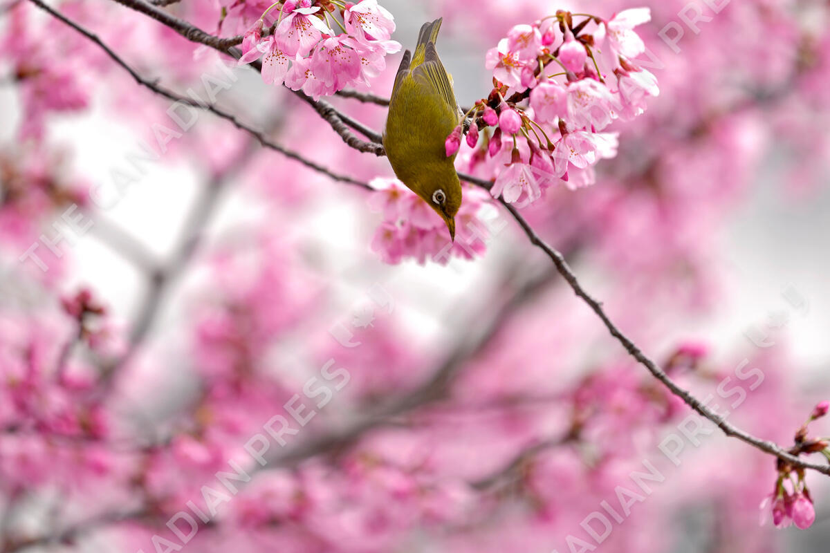 A Japanese white-eye, also known as Mejiro, drinks the nectar of a cherry blossom in Tokyo, Japan, Wednesday, March 23, 2022. (AP Photo/Shuji Kajiyama)