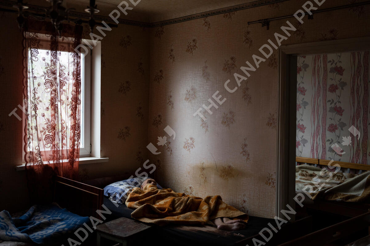 An elderly man in a bed at a hospice in Chasiv Yar city, Donetsk district, Ukraine, Monday, April 18, 2022. At least 35 men and women, some in wheelchairs and most of them with mobility issues, were helped by volunteers to flee from the region that has been under attack in the last weeks. They are being transported to Khmelnytskyi, in western Ukraine. (AP Photo/Petros Giannakouris)