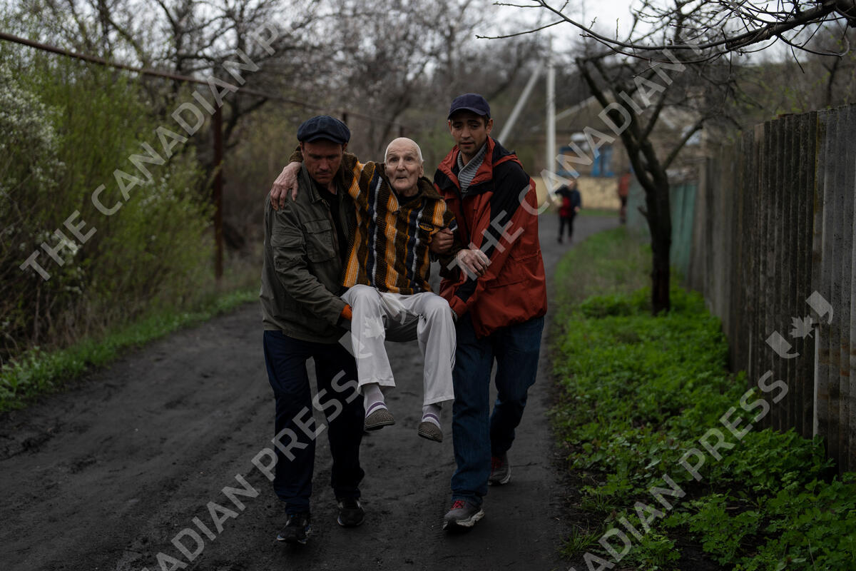 Elderly people are evacuated from a hospice in Chasiv Yar city, Donetsk district, Ukraine, Monday, April 18, 2022. At least 35 men and women, some in wheelchairs and most of them with mobility issues, were helped by volunteers to flee from the region that has been under attack in the last weeks. They are being transported to Khmelnytskyi, in western Ukraine. (AP Photo/Petros Giannakouris)