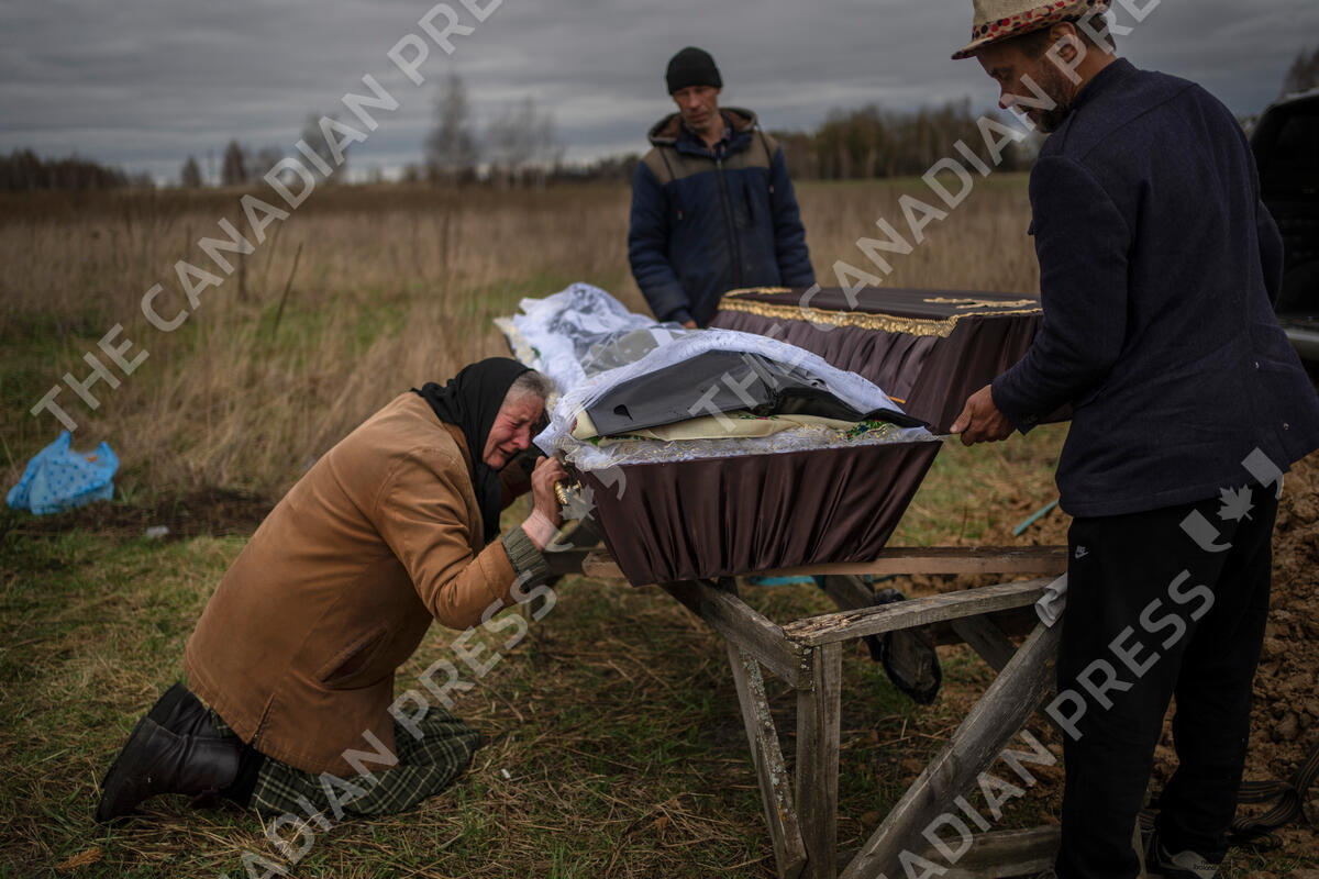 Nadiya Trubchaninova, 70, cries while holding the coffin of her son Vadym, 48, who was killed by Russian soldiers last March 30 in Bucha, during his funeral in the cemetery of Mykulychi, on the outskirts of Kyiv, Ukraine, Saturday, April 16, 2022. After nine days since the discovery of Vadym's corpse, finally Nadiya could have a proper funeral for him. This is not where Nadiya Trubchaninova thought she would find herself at 70 years of age, hitchhiking daily from her village to the shattered town of Bucha trying to bring her son's body home for burial. (AP Photo/Rodrigo Abd)
