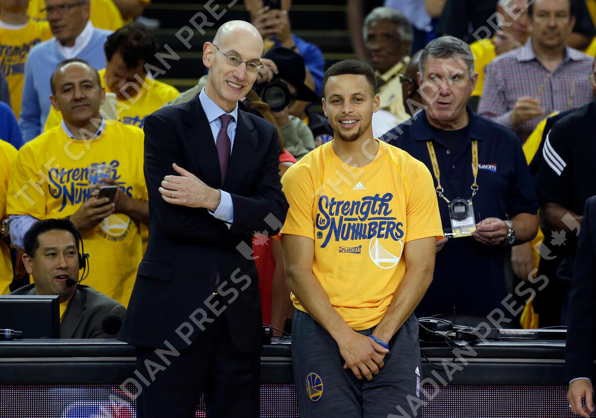 FILE - Golden State Warriors' Stephen Curry, right, smiles with NBA Commissioner Adam Silver as Curry was presented with NBA Most Valuable Player award before Game 5 of the team's second-round playoff series against the Portland Trail Blazers on May 11, 2016, in Oakland, Calif. (AP Photo/Marcio Jose Sanchez, File)