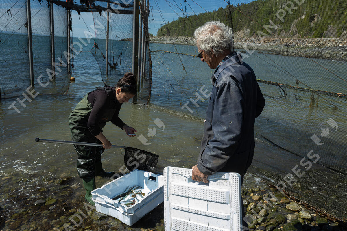 Julie Gauthier looks at her catches in her fish weir installation in Ste-Irenne (Ste. Irenne) on Thursday, June 10, 2021. THE CANADIAN PRESS IMAGES/Francis Vachon