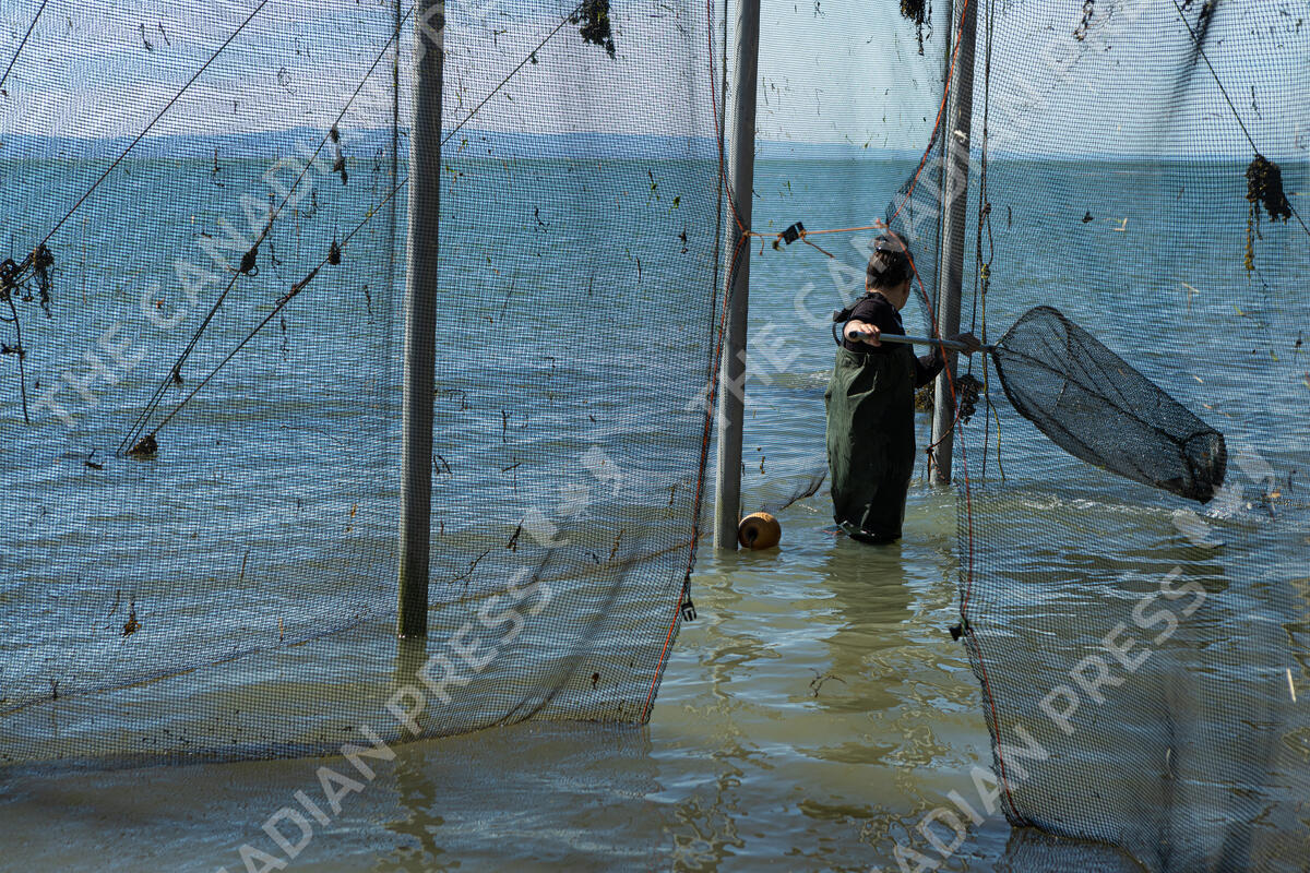 Julie Gauthier looks at her catches in her fish weir installation in Ste-Irenne (Ste. Irenne) on Thursday, June 10, 2021. THE CANADIAN PRESS IMAGES/Francis Vachon