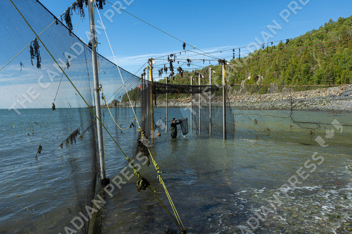 Julie Gauthier looks at her catches in her fish weir installation in Ste-Irenne (Ste. Irenne) on Thursday, June 10, 2021. THE CANADIAN PRESS IMAGES/Francis Vachon