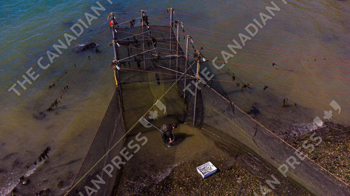 Julie Gauthier looks at her catches in her fish weir installation in Ste-Irenne (Ste. Irenne) on Thursday, June 10, 2021. THE CANADIAN PRESS IMAGES/Francis Vachon