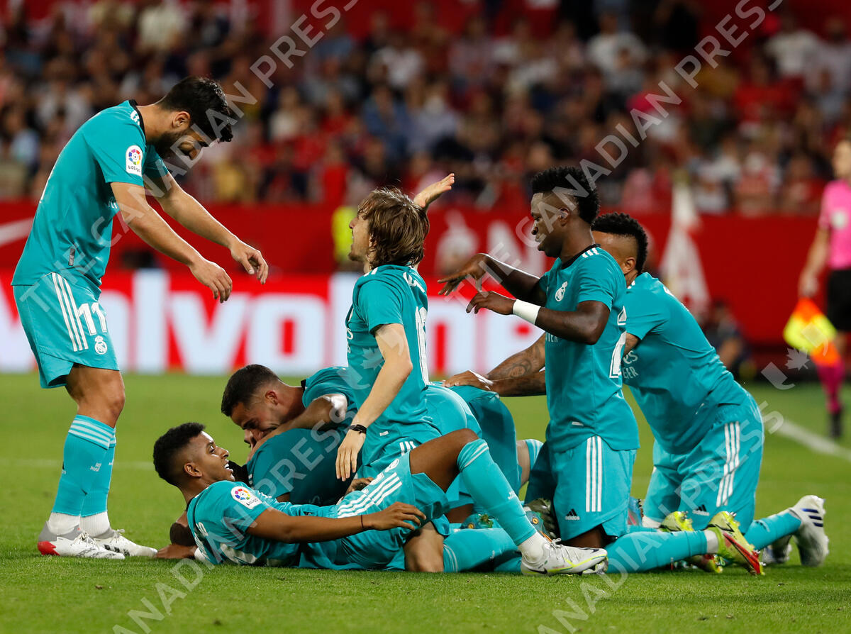 Real Madrid's Karim Benzema celebrates with teammates after scoring his side's third goal during a Spanish La Liga soccer match between Sevilla and Real Madrid at the Ramon Sanchez Pizjuan stadium, in Seville, Spain, Sunday, April 17, 2022. (AP Photo/Angel Fernandez)