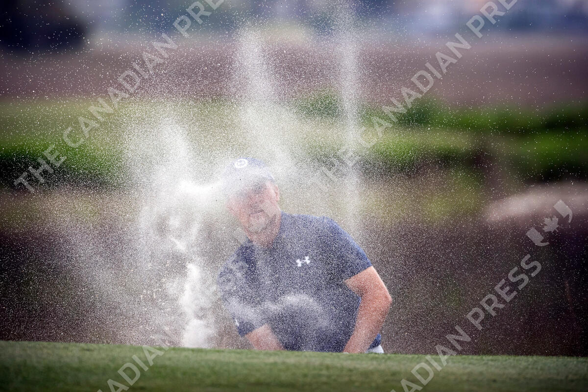 Jordan Spieth watches his shot out of the bunker on the 18th hole from behind a cloud of sand during a one-hole playoff with Patrick Cantlay at the RBC Heritage golf tournament, Sunday, April 17, 2022, in Hilton Head Island, S.C. (AP Photo/Stephen B. Morton)