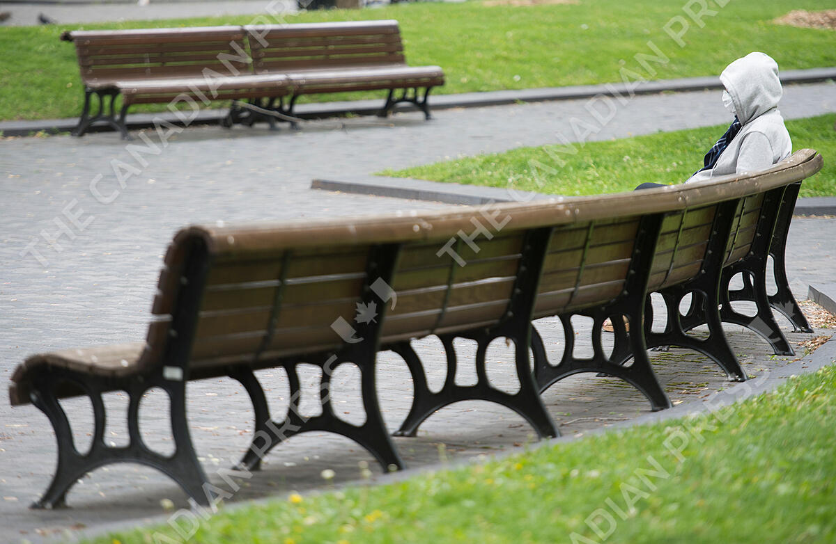 A person wears a face mask as they sit alone in a city park in Montreal, Sunday, May 31, 2020, as the COVID-19 pandemic continues in Canada and around the world. THE CANADIAN PRESS/Graham Hughes
