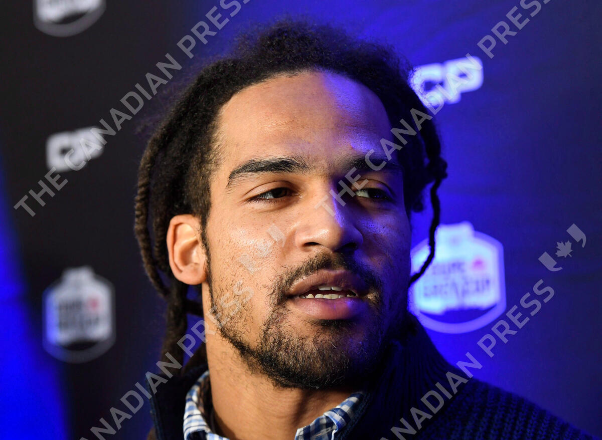 Toronto Argonauts linebacker Marcus Ball speaks to reporters after arriving at the airport in Ottawa, ahead of his team's Grey Cup match against the Calgary Stampeders, on Tuesday, Nov. 21, 2017. THE CANADIAN PRESS/Justin Tang
