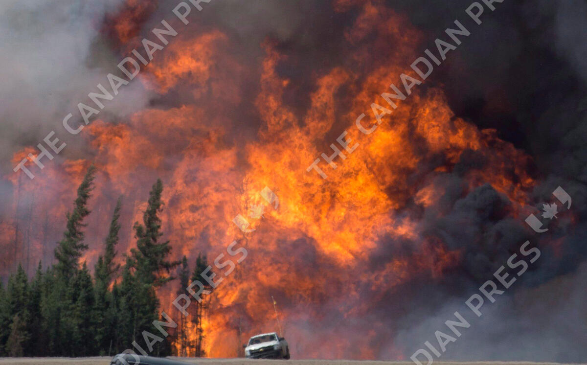 A giant fireball is seen as a wildfire rips through the forest 16 kilometres south of Fort McMurray, Alta. on Highway 63 Saturday, May 7, 2016. THE CANADIAN PRESS/Jonathan Hayward