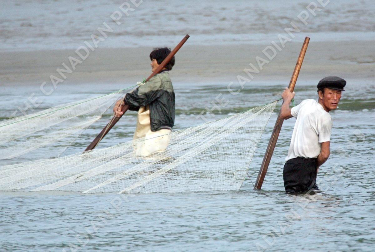 A North Korean couple pull a fishing net through water in the town of Sinuiju July 8, 2006. China and North Korea are separated by the Yalu River, upon which Chinese tourists take pleasure cruises across the water to observe their less economically developed neighbors. Yalu River, China on July 8, 2006. Photo by Tim Johnson/MCT/ABACAPRESS.COM