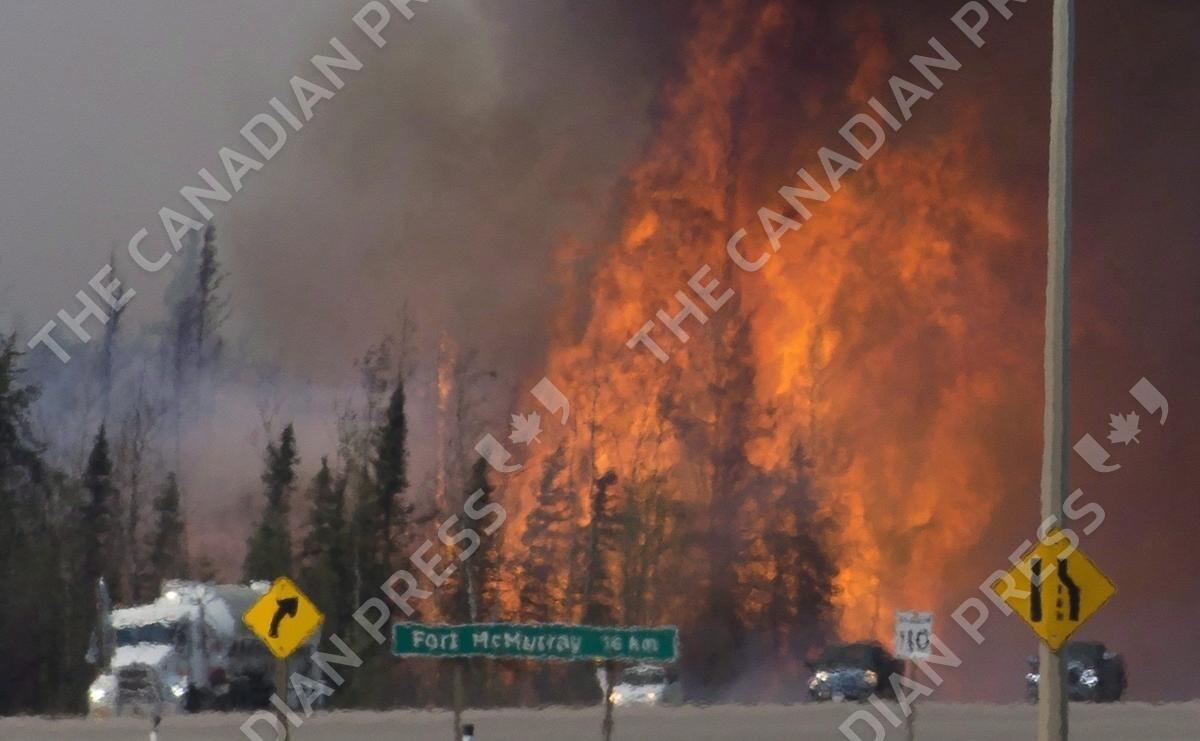 Heat waves are seen as cars and trucks try and get past a wild fire 16km south of Fort McMurray on Highway 63, Friday, May 6, 2016. The Fort McMurray fire is among Canada's biggest wildfires in the last two decades. THE CANADIAN PRESS/Jonathan Hayward
