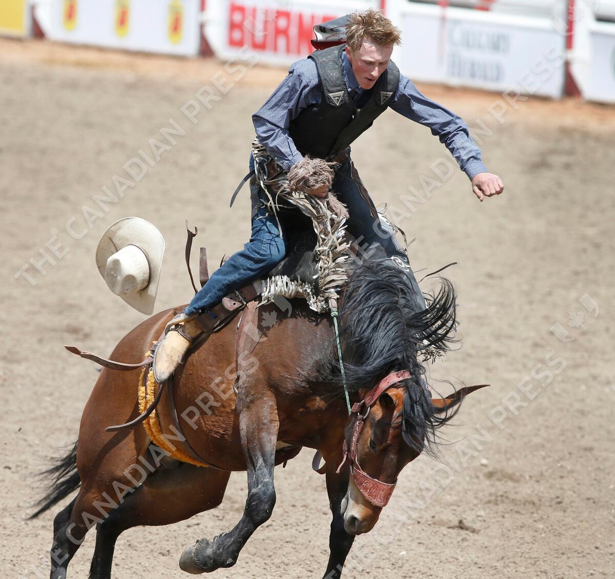 The Saddle Bronc Riding event at the Calgary Stampede rodeo in Calgary, Alberta on July 8, 2019. THE CANADIAN PRESS IMAGES/Larry MacDougal