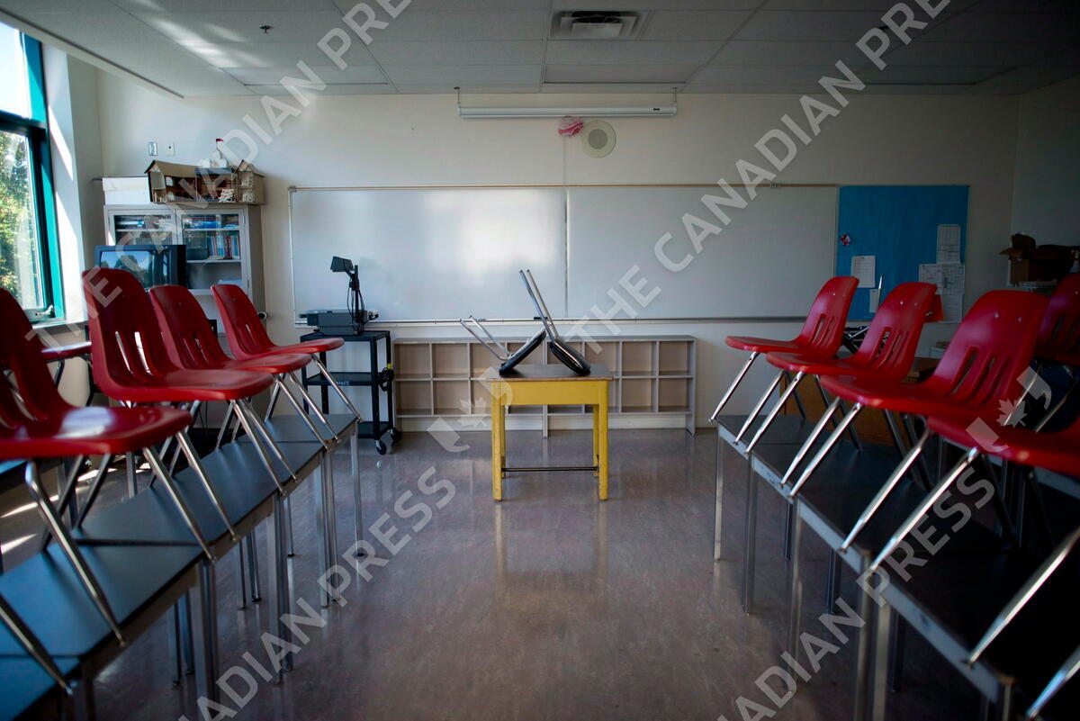 A empty classroom is pictured at McGee Secondary school in Vancouver, B.C. Friday, Sept. 5, 2014. Some private schools afraid they'd be blamed if a student gets COVID-19 are considering waivers to absolve them, but experts say that wouldn't stop a parent from suing or a school from racking up legal bills. THE CANADIAN PRESS/Jonathan Hayward