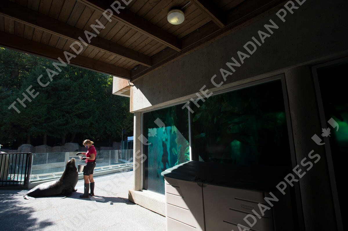 Vancouver Aquarium staffer Jessica DeBenedetto feeds a sea lion in the main walkway of the aquarium Thursday, September 10, 2020. The Vancouver Aquarium has had to close its doors to the public due to the lack of visitors during the COVID-19 pandemic. THE CANADIAN PRESS/Jonathan Hayward
