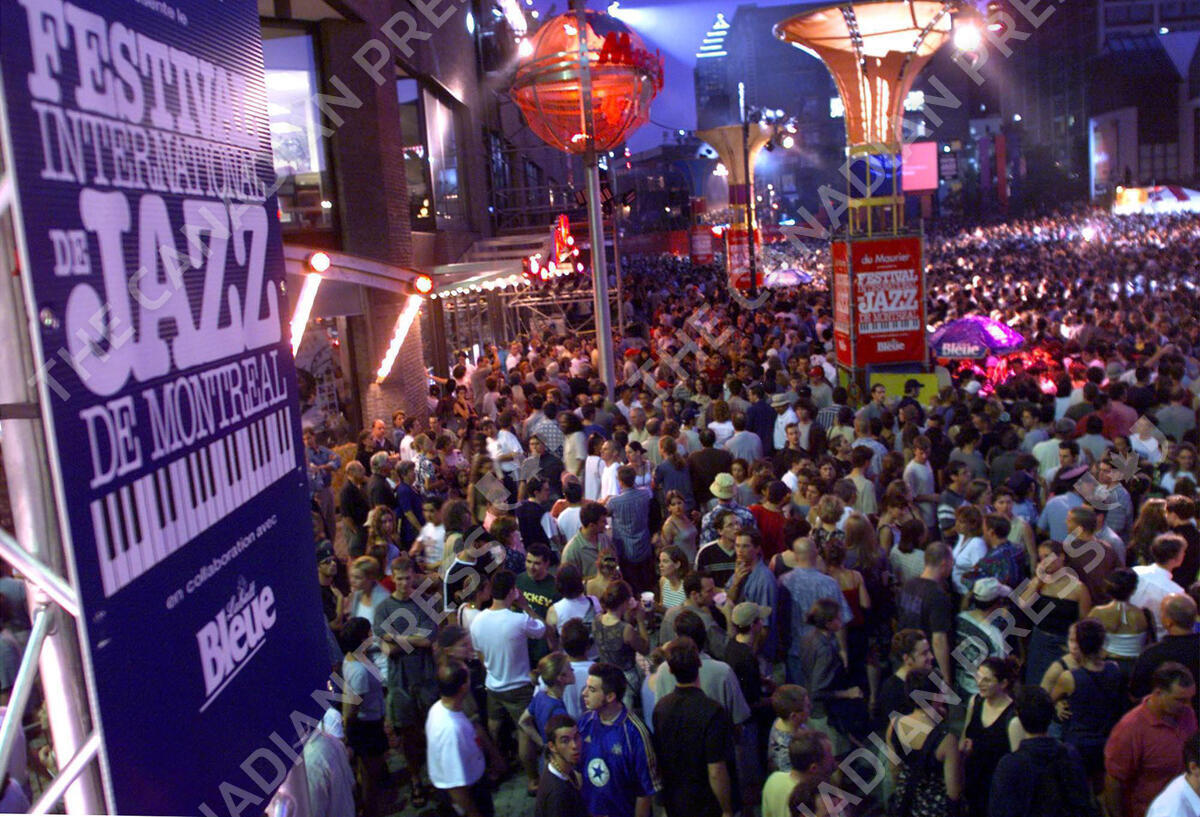 A huge crowd gathers for the annual giant mid-festival street show at the Montreal International Jazz Festival Tuesday in Montreal, July 6, 1999. This year's edition of the Montreal International Jazz Festival may have given concertgoers a glimpse of how they may have to enjoy musical performances for the next little while. THE CANADIAN PRESS/Paul Chiasson