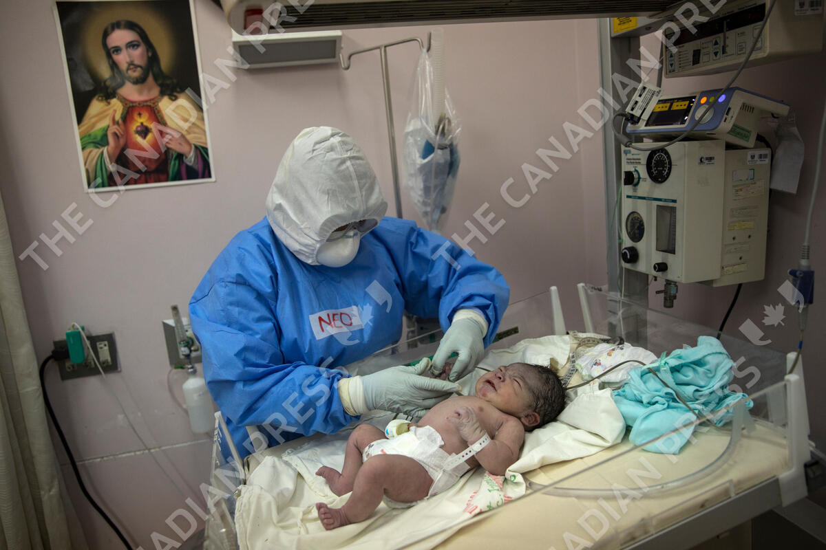 A neonatologist examines a newborn baby at the National Maternal Perinatal Institute in an isolated area reserved for mothers infected with COVID-19, in Lima, Peru, Wednesday, July 29, 2020. The 24-year-old first-time mother wept during her labor not just from pain, but because the baby would be born without her father. The baby's father died from the new coronavirus in June. (AP Photo/Rodrigo Abd)