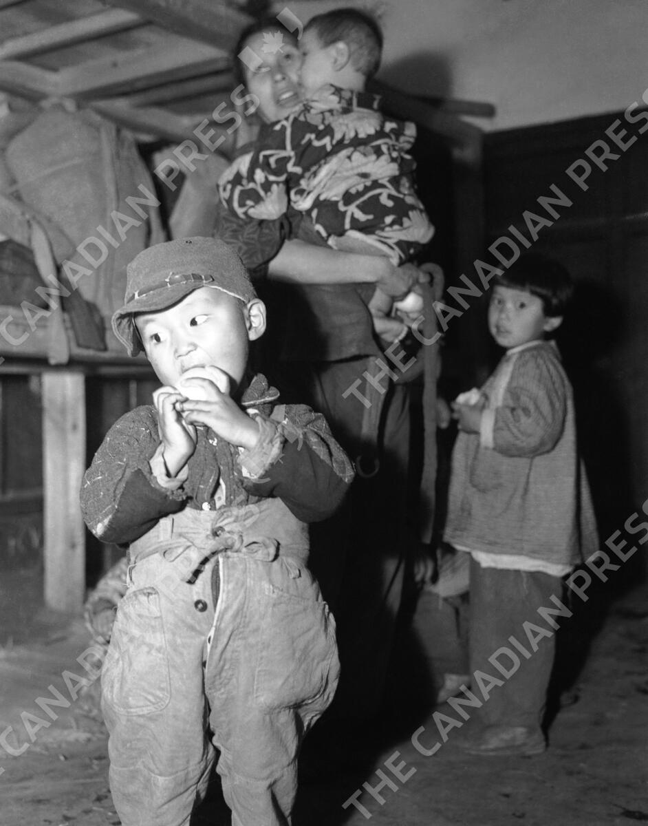 FILE - In this Oct. 12, 1946, file photo, a Japanese youngster, hungry after a long train trip from Russian-controlled Manchuria, munches an apple provided by the Japanese Red Cross on his arrival in Tokyo, in the first group of Japanese to be repatriated by the Russians. At the end of the World War II, about 400,000 Japanese, including families of Imperial Army soldiers, Manchurian railway employees and farmers who had emigrated were in northern China, where Japan established a wartime puppet state. (AP Photo/Charles Gorry, File)