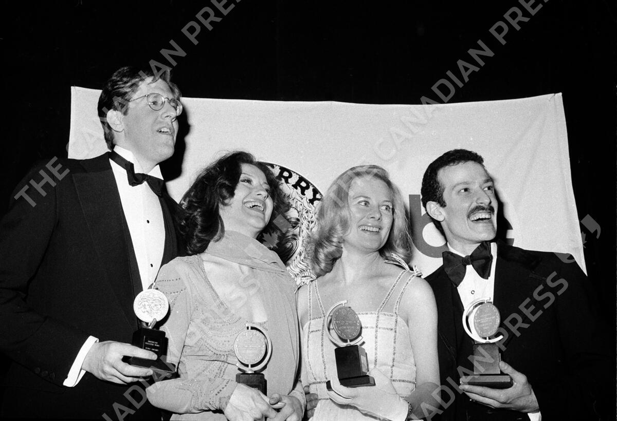 FILE - This April 18, 1976 file photo shows Tony winners, from left, Edward Herrmann, Carole Bishop, Shirley Knight and Sammy Williams, pose with their awards at the 30th Annual Tony Awards in New York. Herrmann won best actor in a play for "Mrs. Warren's Profession"; Bishop won best actress in a musical for "A Chorus Line"; Knight won best actress in a play for "Kennedy's Children"; and Williams won best actor in a musical for "A Chorus Line." Knight, the Kansas-born actress who was nominated for two Oscars early in her career and went on to play an astonishing variety of roles in movies, TV and the stage, has died. She was 83. Kaitlin Hopkins says her mother passed away Wednesday of natural causes in San Marcos, Texas. (AP Photo, File)
