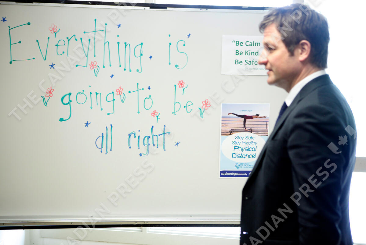 B.C. Minister of Education Rob Fleming walks past a white board at Monterey Middle School following an update on part-time return to classes in Victoria, B.C., on June 2, 2020. THE CANADIAN PRESS/Chad Hipolito
