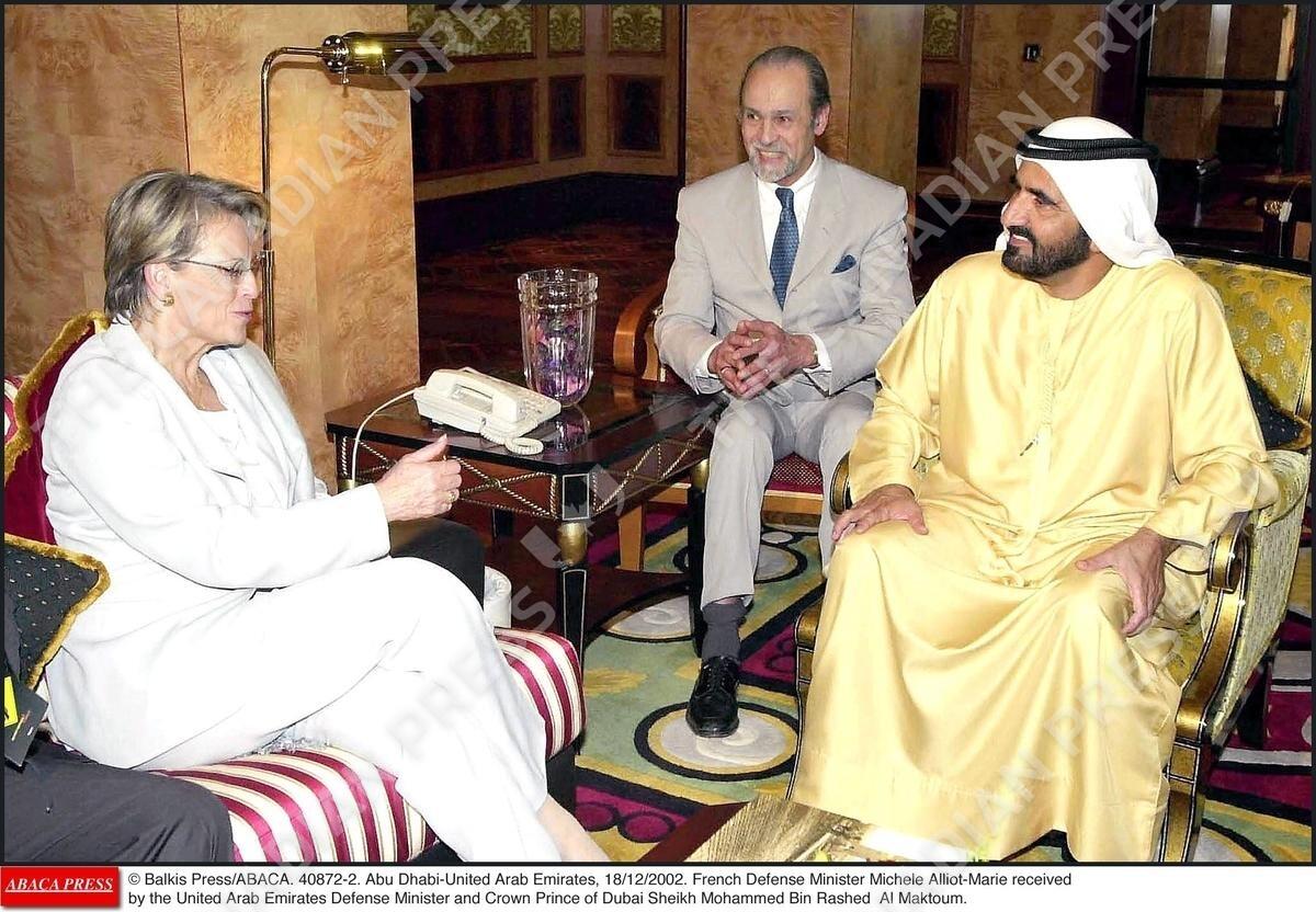 © Balkis Press/ABACA. 40872-2. Abu Dhabi-United Arab Emirates, 18/12/2002. French Defense Minister Michele Alliot-Marie received by the United Arab Emirates Defense Minister and Crown Prince of Dubai Sheikh Mohammed Bin Rashid Al Maktoum.