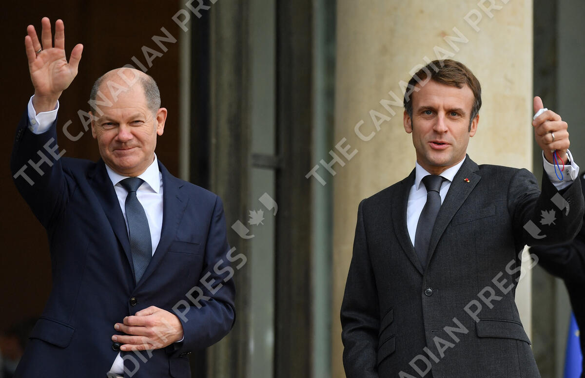 French President Emmanuel Macron greets German Chancellor Olaf Scholz ahead of their meeting at the Elysee presidential palace on December 10, 2021 in Paris, France. This is the first trip abroad of the German Chancellor since his election. Photo by Christian Liewig/ABACAPRESS.COM